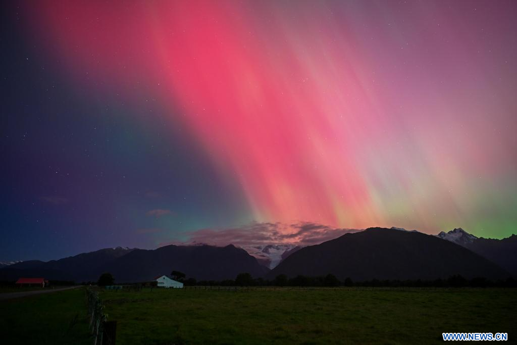WELLINGTON, 11 mai (Xinhua) -- Photo prise le 11 mai 2024 de l'aurore australe, également connue sous le nom de "lumières du sud", depuis le glacier Fox sur la côte ouest de l'Ile du Sud, en Nouvelle-Zélande. (Xinhua/Yang Liu)