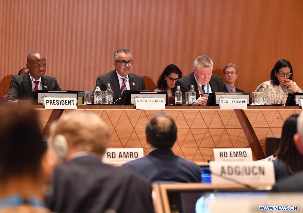 GENEVE, 28 mai (Xinhua) -- Tedros Adhanom Ghebreyesus (2e à gauche), directeur général de l'Organisation mondiale de la santé (OMS), s'exprime lors de la 77e Assemblée mondiale de la santé (AMS) à Genève en Suisse, le 27 mai 2024 . La 77e AMS de six jours, sous le thème "Tous pour la santé, la santé pour tous", s'est ouverte lundi. (Xinhua/Lian Yi)