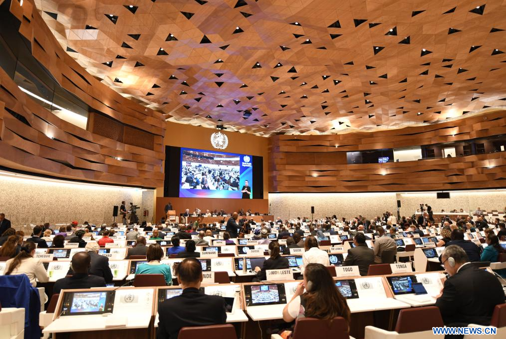 GENEVE, 28 mai (Xinhua) -- Photo prise le 27 mai 2024 montrant une scène lors de la 77e Assemblée mondiale de la santé (AMS) à Genève en Suisse. Sous le thème "Tous pour la santé, la santé pour tous", la 77e AMS s'est ouverte lundi. (Xinhua/Lian Yi)