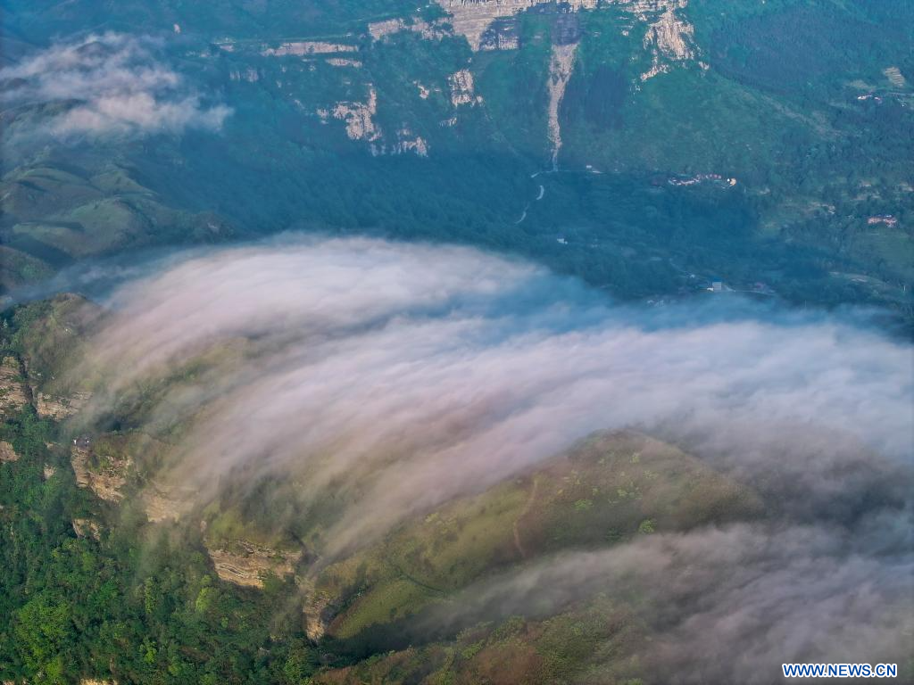 Cette photo aérienne prise par le drone le 23 mai 2024 montre des nuages dévalant du mont Jinfo, à Chongqing, municipalité située dans le sud-ouest de la Chine. (Xinhua/Liu Chan)