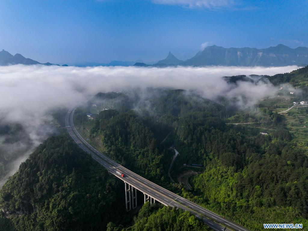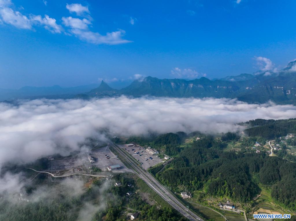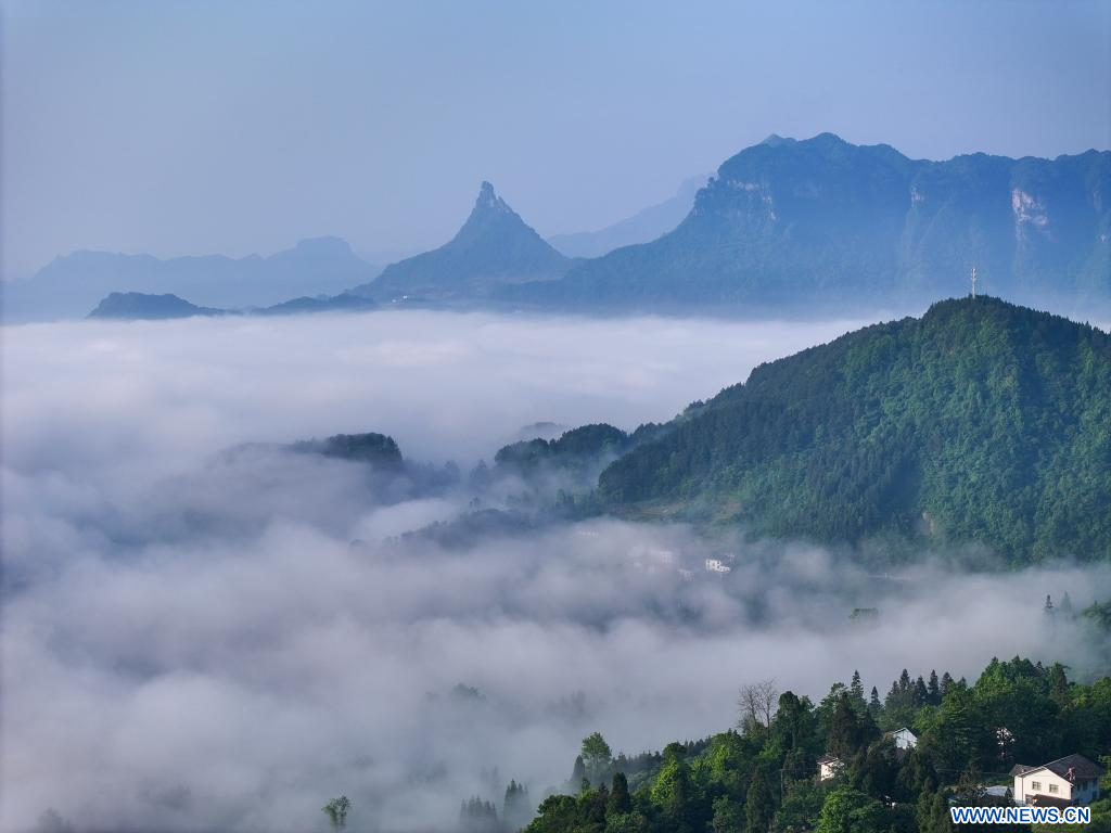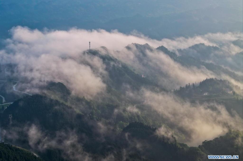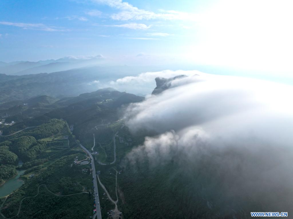 Cette photo aérienne prise par le drone le 23 mai 2024 montre le paysage d'une mer de nuages sur le mont Jinfo, à Chongqing, municipalité située dans le sud-ouest de la Chine. (Xinhua/Liu Chan)