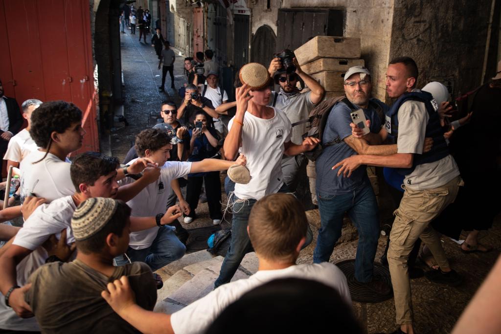 Un homme portant un gilet de presse entre en conflit avec des participants à la marche de drapeaux pour marquer la Journée de Jérusalem, le 5 juin 2024.
