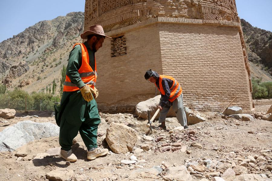 GHOR (Afghanistan), 29 juillet (Xinhua) -- Des ouvriers dégagent des pierres après une inondation près du minaret de Djam, dans le district de Shahrak, dans la province de Ghor, dans le centre de l'Afghanistan, le 28 juillet 2024. Le minaret de Djam, avec ses vestiges archéologiques, a été inscrit sur la liste du patrimoine mondial par l'Organisation des Nations Unies pour l'éducation, la science et la culture (UNESCO) en 2002. En mai, une énorme inondation a frappé la province, menaçant le minaret, qui se trouve près de la rivière Hari. (Xinhua/Saifurahman Safi)