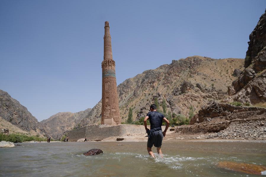 Un homme se rafraîchit dans la rivière Hari, dans le district de Shahrak, dans la province de Ghor, dans le centre de l'Afghanistan, le 28 juillet 2024. Le minaret de Djam, avec ses vestiges archéologiques, a été inscrit sur la liste du patrimoine mondial par l'Organisation des Nations Unies pour l'éducation, la science et la culture (UNESCO) en 2002. En mai, une énorme inondation a frappé la province, menaçant le minaret, qui se trouve près de la rivière Hari. (Xinhua/Zhao Jiasong)■