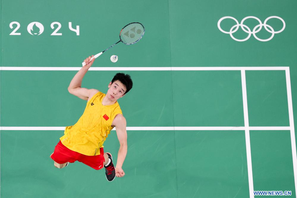 PARIS, 1er août (Xinhua) -- Photo prise le 1er août 2024 montrant le Chinois Li Shifeng lors du huitième de finale de badminton simple hommes contre le Singapourien Loh Kean Yew aux Jeux olympiques de Paris 2024 à Paris, en France. (Xinhua/Chen Yichen)