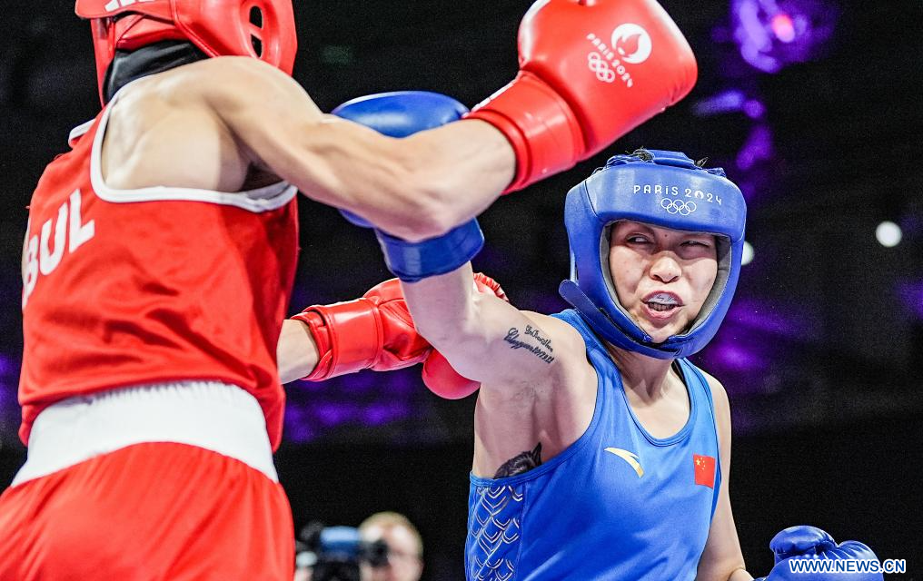 PARIS, 1er août (Xinhua) -- La Chinoise Chang Yuan (à droite) affronte la Bulgare Stanimira Petrova lors du quart de finale de boxe féminine 54 kg aux Jeux olympiques de Paris 2024 à Paris, en France. (Xinhua/Jiang Wenyao)