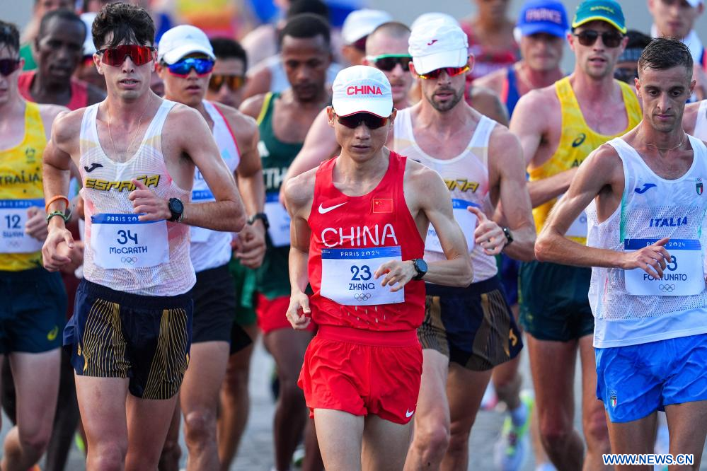 PARIS, 1 août (Xinhua) -- Photo prise le 1er août 2024 montrant le Chinois Zhang Jun (au centre) lors de la marche hommes de 20 km aux Jeux olympiques de Paris 2024 à Paris, en France. (Xinhua/Xu Chang)