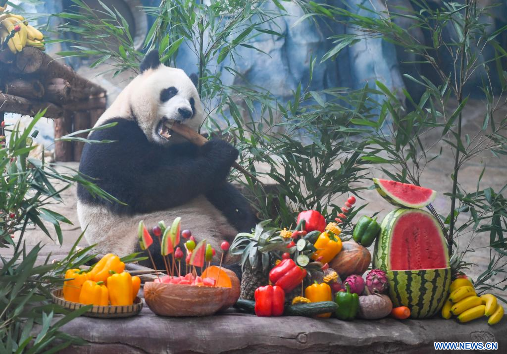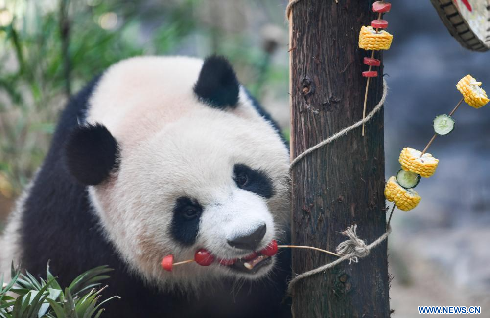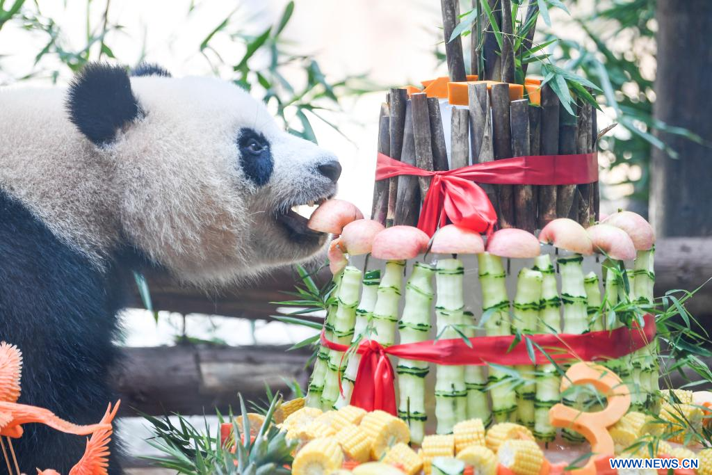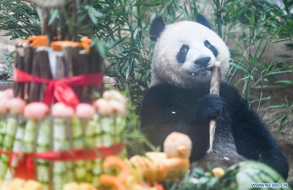 YONGCHUAN, 7 août (Xinhua) -- Le panda géant Qing Lu se régale durant un gala d'anniversaire dans le parc à thème Locajoy du district de Yongchuan, dans la municipalité chinoise de Chongqing (sud-ouest), le 6 août 2024. Un événement spécial a été organisé mardi pour fêter les anniversaires des pandas jumeaux Qing Hua et Qing Lu, âgées de trois ans, et de Qiao Yue, âgée de six ans. (Photo : Wang Quanchao)