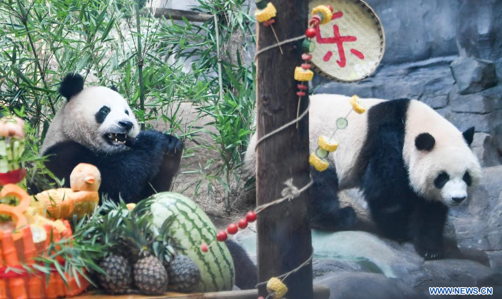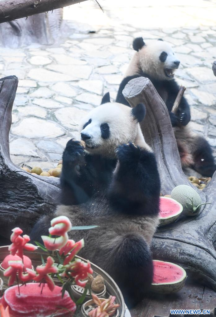 YONGCHUAN, 7 août (Xinhua) -- Les pandas jumeaux Qing Hua et Qing Lu lors d'un gala d'anniversaire dans le parc à thème Locajoy du district de Yongchuan, dans la municipalité chinoise de Chongqing (sud-ouest), le 6 août 2024. Un événement spécial a été organisé mardi pour fêter les anniversaires des pandas jumeaux Qing Hua et Qing Lu, âgées de trois ans, et de Qiao Yue, âgée de six ans. (Photo : Wang Quanchao)