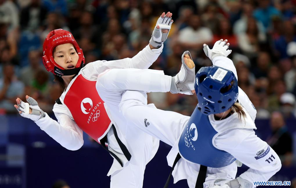 PARIS, 7 août (Xinhua) -- La Chinoise Guo Qing (à gauche) lors des huitièmes de finale du taekwondo féminin des 49 kg aux Jeux olympiques de Paris 2024 à Paris, en France, le 7 août 2024. (Xinhua/Li Ying)