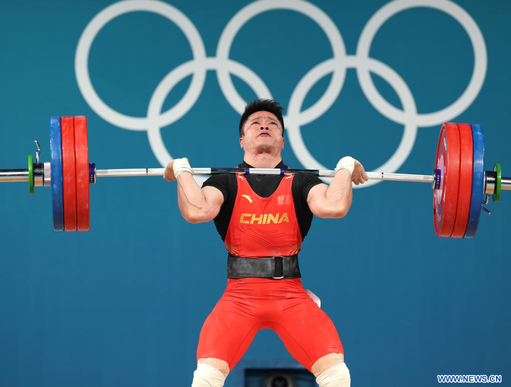 PARIS, 7 août (Xinhua) -- Photo prise le 7 août 2024 montrant le Chinois Li Fabin lors de l'épreuve masculine d'haltérophilie des 61 kg aux Jeux olympiques de Paris 2024 à Paris, en France. (Xinhua/Yang Lei)