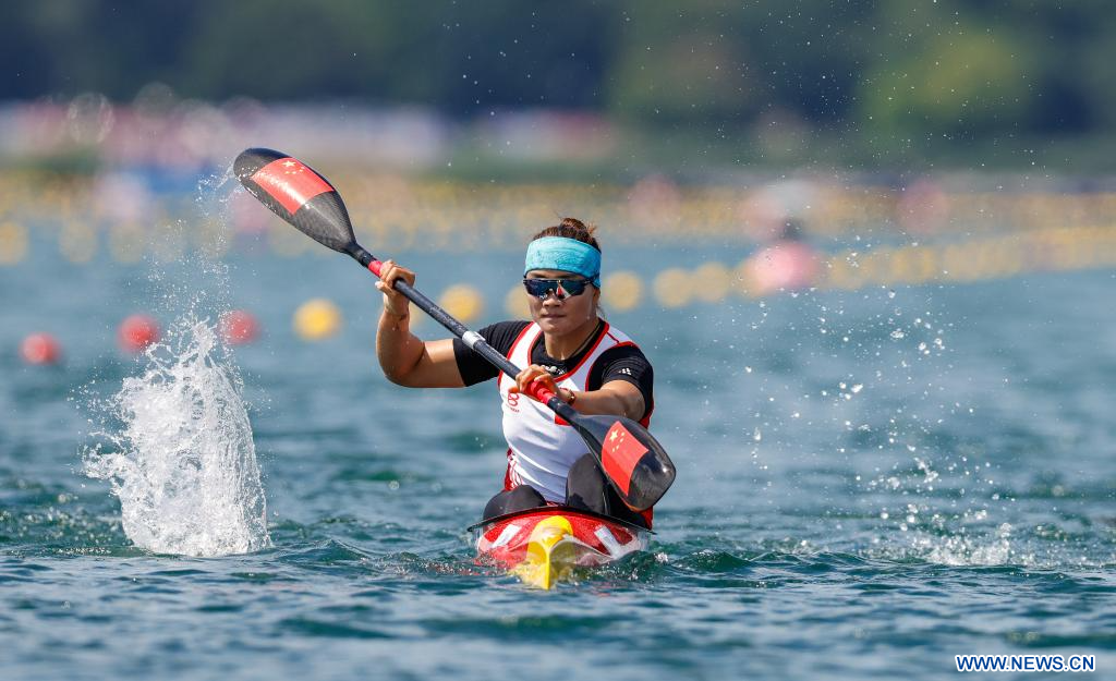VAIRES-SUR-MARNE, 7 août (Xinhua) -- Photo prise le 7 août 2024 montrant la Chinoise Yin Mengdie lors des quarts de finale du canoë-kayak sprint 500m monoplace femmes aux Jeux olympiques de Paris 2024 à Vaires-sur-Marne, en France. (Xinhua/Shen Bohan)