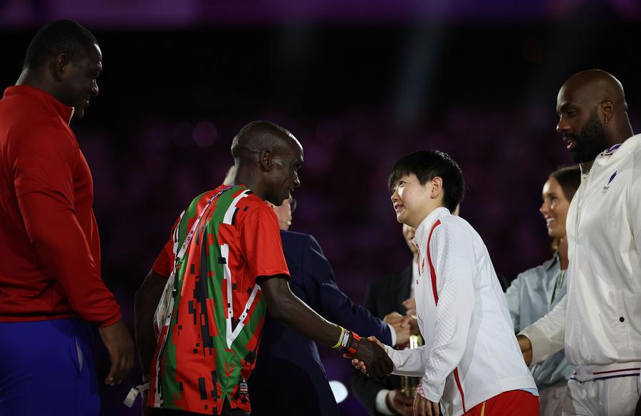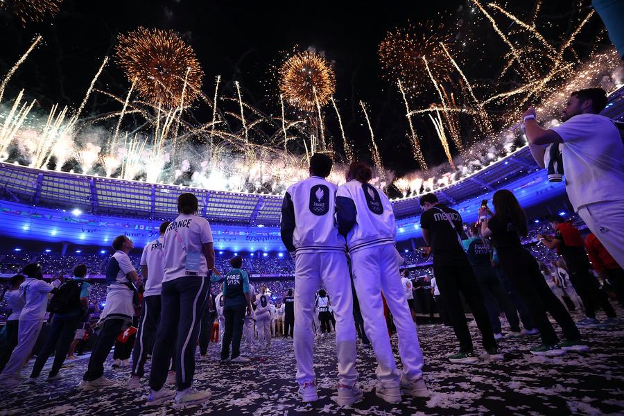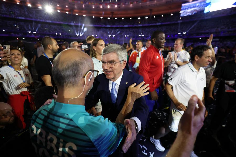 PARIS, 11 août (Xinhua) -- Le président du Comité international olympique (CIO) Thomas Bach (centre) salue un volontaire au cours de la cérémonie de clôture des Jeux olympiques 2024 de Paris à la capitale de la France, le 11 août. (Xinhua/Li Ming)La joueuse chinoise de tennis de table Sun Yingsha (à droite, au premier plan) serre la main d'autres athlètes lors de la cérémonie de clôture des Jeux olympiques 2024 de Paris, à la capitale de la France, le 11 août. (Xinhua/Li Ming)Les athlètes contemplent les feux d'artifice au cours de la cérémonie de clôture des Jeux olympiques 2024 de Paris, à la capitale de la France, le 11 août. (Xinhua/Li Ming)La cérémonie de clôture des Jeux olympiques 2024 de Paris se tient en France, le 11 août. (Xinhua/Xia Yifang)