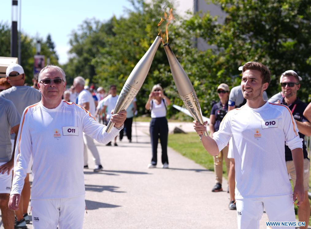 PARIS, 28 août (Xinhua) -- Cédric Olivier, porteur de la flamme olympique (à droite), la transmet à Pascal Bellanger lors du relais de la flamme des Jeux Paralympiques de Paris 2024 à Fontainebleau, en France, le 27 août 2024. (Xinhua/Lian Yi)