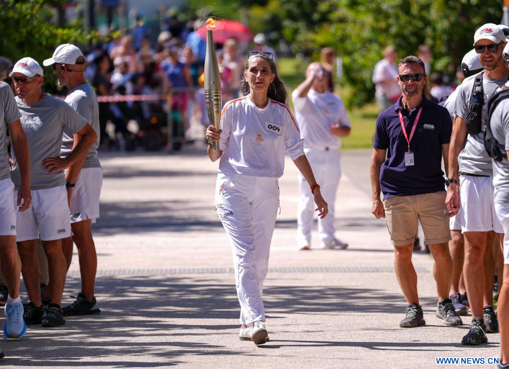 PARIS, 28 août (Xinhua) -- Oriane Atoembe, porteuse de la flamme olympique, lors du relais de la flamme des Jeux Paralympiques de Paris 2024 à Fontainebleau, en France, le 27 août 2024. (Xinhua/Lian Yi)