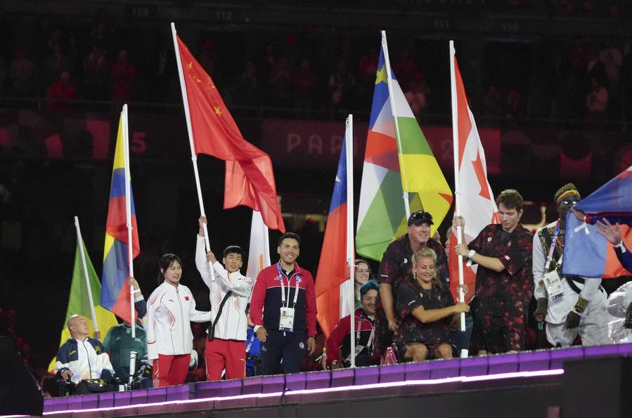 PARIS, 9 septembre (Xinhua) -- Les porte-drapeaux de la Chine Di Dongdong (3e à gauche) et Jiang Yuyan (2e à gauche) arrivent pour la cérémonie de clôture des Jeux paralympiques de Paris 2024, en France, le 8 septembre 2024. (Xinhua/Cai Yang)