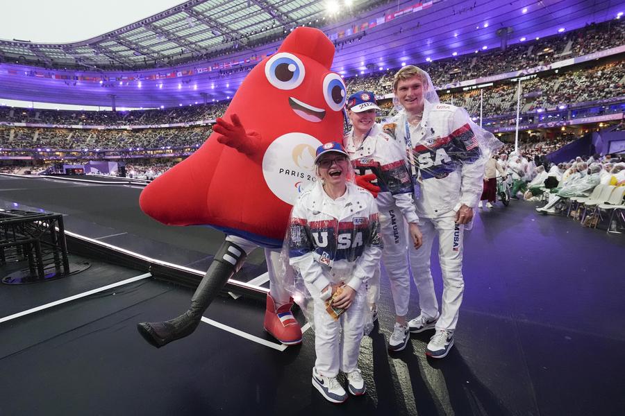 PARIS, 9 septembre (Xinhua) -- Des membres de la délégation des Etats-Unis posent avec la mascotte paralympique Phryge lors de la cérémonie de clôture des Jeux paralympiques de Paris 2024, en France, le 8 septembre 2024. (Xinhua/Cai Yang)■
