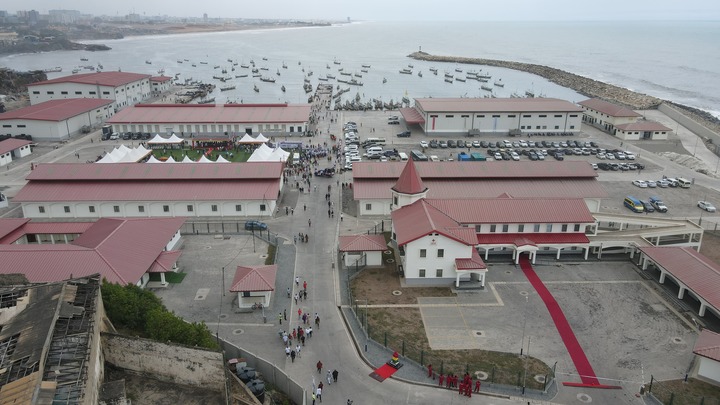 ACCRA, 15 septembre (Xinhua) -- Photo prise par un drone aérien le 13 septembre 2024 montrant une vue du complexe du port de pêche de Jamestown construit par la Chine à Accra, au Ghana. (Xinhua/Seth)Le président ghanéen Nana Addo Dankwa Akufo-Addo s'adresse à la cérémonie d'inauguration du complexe du port de pêche de Jamestown, construit par la Chine, à Accra au Ghana, le 13 septembre 2024.■
