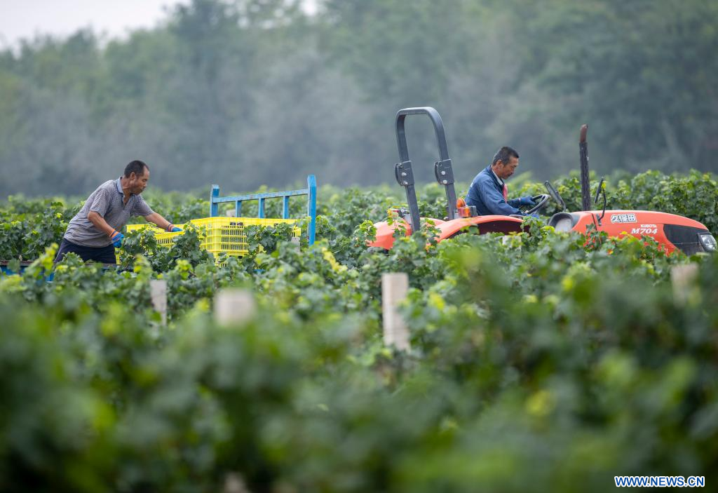 YINCHUAN, 22 septembre (Xinhua) -- Deux agriculteurs transportent des raisins récoltés dans un vignoble au pied oriental du mont Helan, dans la région autonome Hui du Ningxia, dans le nord-ouest de la Chine, le 19 septembre 2024. Bénéficiant d'un climat sec et d'un ensoleillement abondant, le pied oriental du mont Helan est largement considéré comme une "zone dorée" pour la culture du raisin de cuve et la production de vins haut de gamme. La région est entrée récemment dans la saison des vendanges de cette année. (Photo : Yang Zhisen)