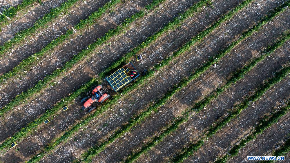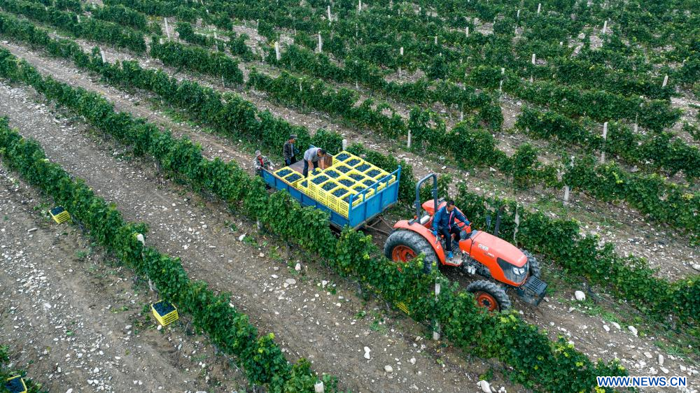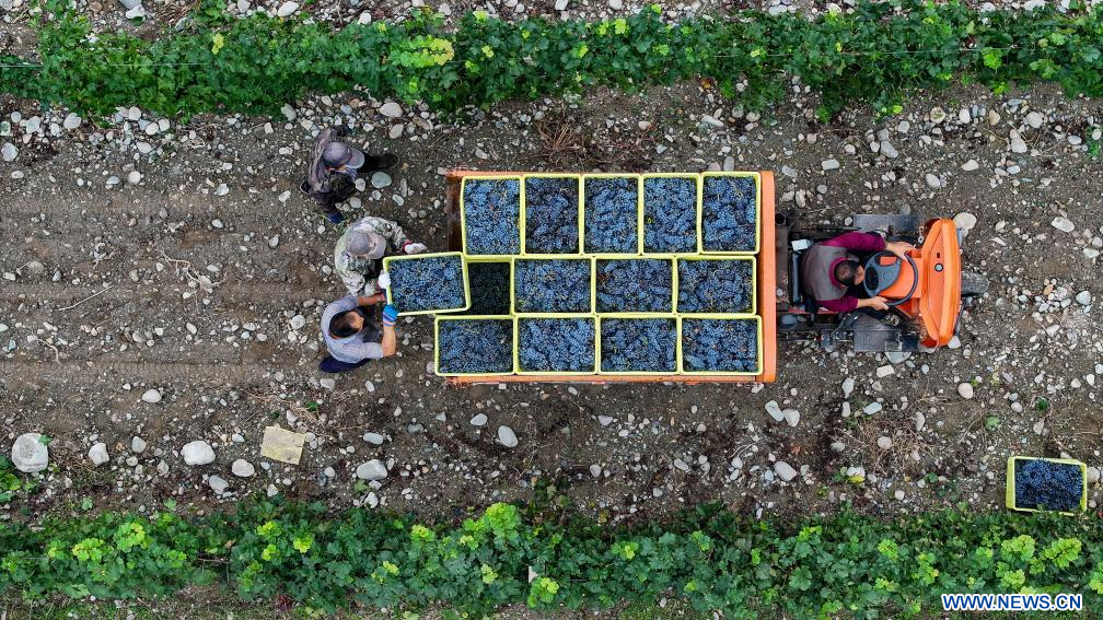 YINCHUAN, 22 septembre (Xinhua) -- Photo aérienne d'agriculteurs transportant des raisins récoltés dans un vignoble au pied oriental du mont Helan, dans la région autonome Hui du Ningxia, dans le nord-ouest de la Chine, le 19 septembre 2024. Bénéficiant d'un climat sec et d'un ensoleillement abondant, le pied oriental du mont Helan est largement considéré comme une "zone dorée" pour la culture du raisin de cuve et la production de vins haut de gamme. La région est entrée récemment dans la saison des vendanges de cette année. (Photo : Yang Zhisen)