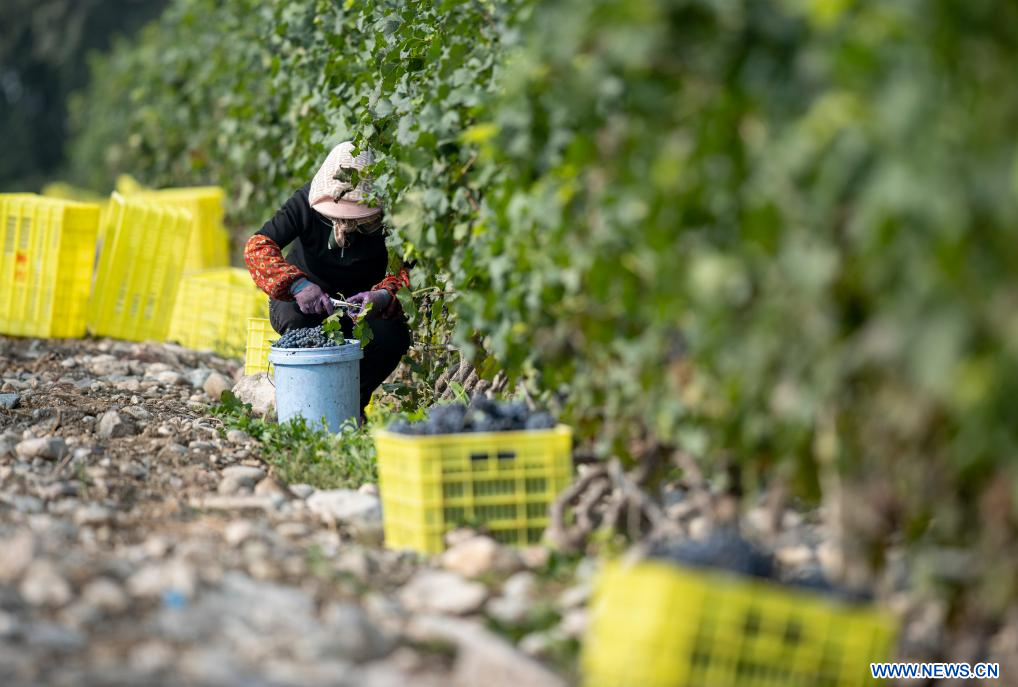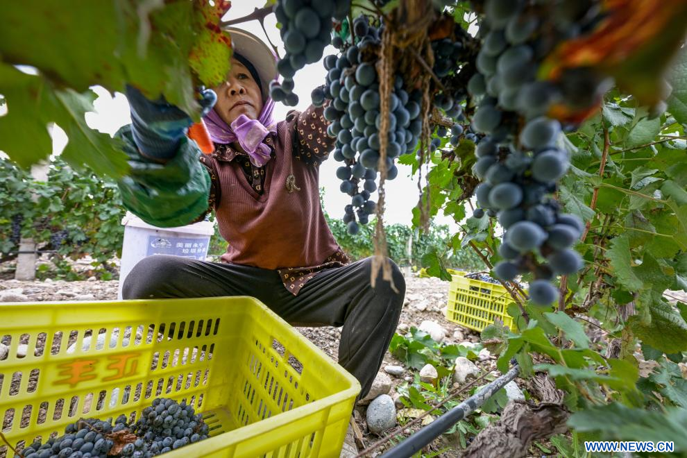 YINCHUAN, 22 septembre (Xinhua) -- Une femme récolte des raisins dans un vignoble au pied oriental du mont Helan, dans la région autonome Hui du Ningxia, dans le nord-ouest de la Chine, le 19 septembre 2024. Bénéficiant d'un climat sec et d'un ensoleillement abondant, le pied oriental du mont Helan est largement considéré comme une "zone dorée" pour la culture du raisin de cuve et la production de vins haut de gamme. La région est entrée récemment dans la saison des vendanges de cette année. (Photo : Yang Zhisen)