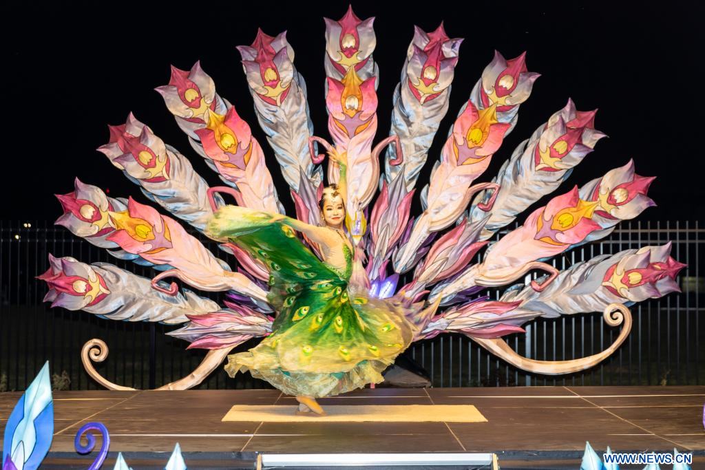 DALLAS, 25 novembre (Xinhua) -- Une danseuse chinoise se produit lors du Festival des lumières Tianyu dans la banlieue de Dallas, au Texas, aux Etats-Unis, le 24 novembre 2024. L'événement, qui se déroule du 8 novembre 2024 au 18 janvier 2025, offre aux visiteurs des installations lumineuses avec des créations acrobatiques et des spectacles folkloriques présentés par des artistes chinois. (Xinhua/Dan Tian)