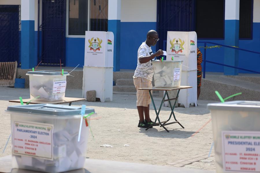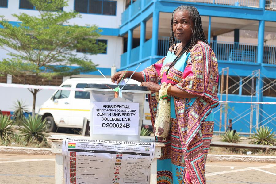 ACCRA, 7 décembre (Xinhua) -- Photo prise le 7 décembre 2024 montrant une électrice déposant son bulletin de vote à Accra, au Ghana. Les électeurs ghanéens se sont rendus samedi aux urnes pour élire un nouveau président et 276 députés. (Xinhua/Seth)Photo prise le 7 décembre 2024 montrant un électeur déposant sont bulletin de vote à Accra, au Ghana.