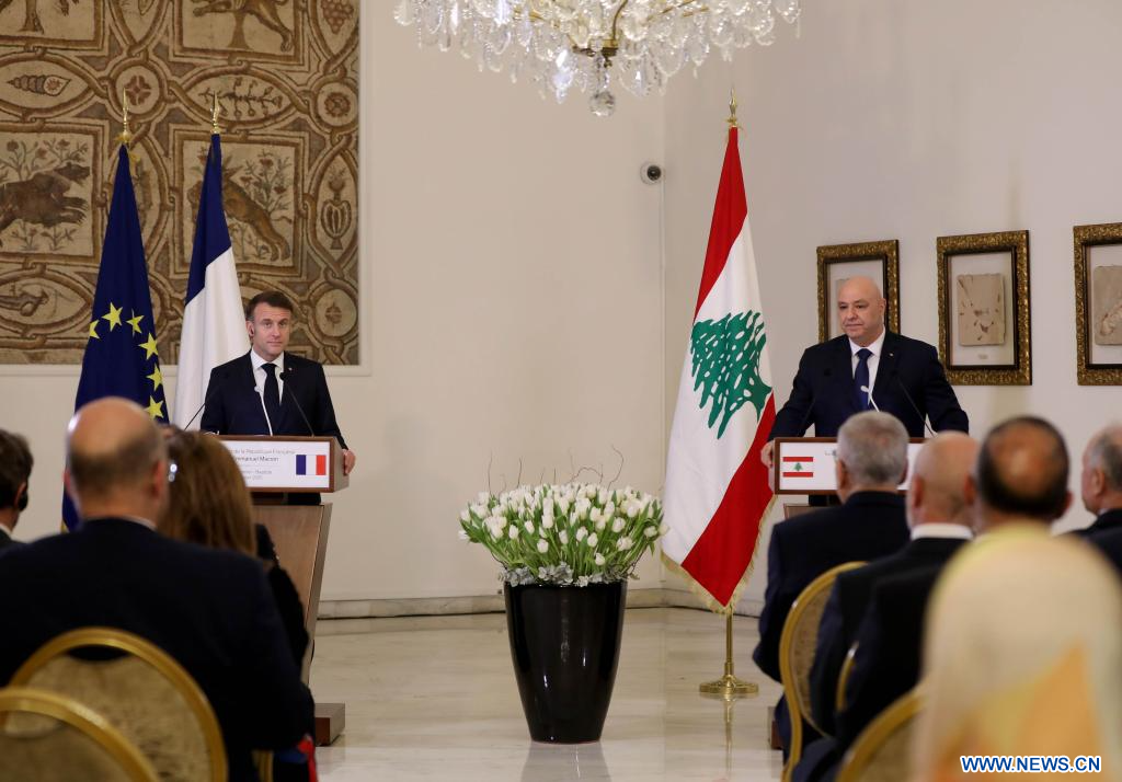 BAABDA (Liban), 17 janvier (Xinhua) -- Le président libanais Joseph Aoun (à droite) et le président français Emmanuel Macron (à gauche) donnent une conférence de presse conjointe au palais de Baabda, au Liban, le 17 janvier 2025. M. Macron a réaffirmé vendredi l'engagement de la France à soutenir l'armée libanaise, en annonçant le projet de création d'un nouveau centre de formation pour les soldats libanais. (Xinhua/Bilal Jawich)