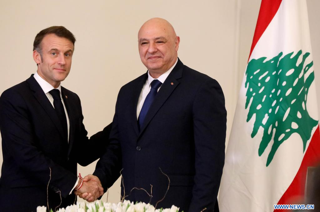 BAABDA (Liban), 17 janvier (Xinhua) -- Le président libanais Joseph Aoun (à droite) serre la main du président français Emmanuel Macron, en visite, lors d'une conférence de presse conjointe au palais de Baabda, au Liban, le 17 janvier 2025. M. Macron a réaffirmé vendredi l'engagement de la France à soutenir l'armée libanaise, en annonçant le projet de création d'un nouveau centre de formation pour les soldats libanais. (Xinhua/Bilal Jawich)