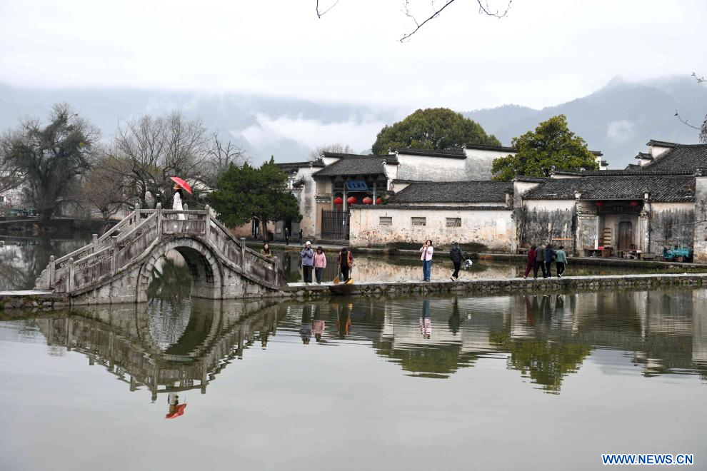 YIXIAN, 16 mars (Xinhua) -- Des touristes prennent du bon temps dans le village de Hongcun, dans le bourg de Hongcun du district de Yixian, dans la ville de Huangshan de la province chinoise de l'Anhui (est), le 14 mars 2025. (Photo : Zhou Mu)