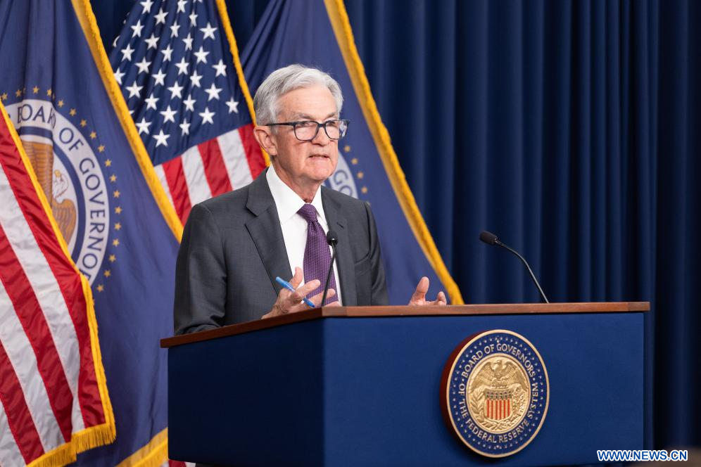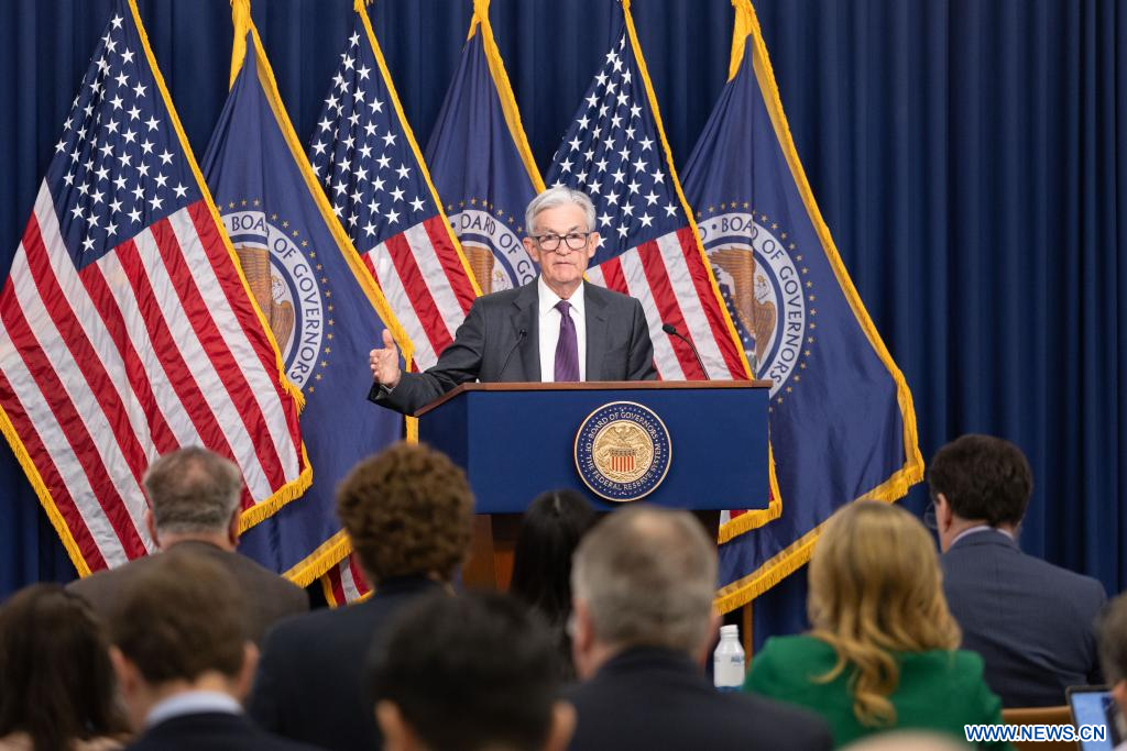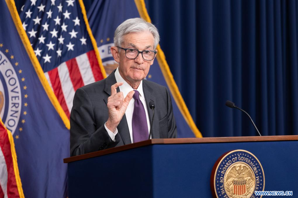 Le président de la Réserve fédérale des Etats-Unis (Fed) Jerome Powell participe à une conférence de presse à Washington, D.C., aux Etats-Unis, le 19 mars 2025. La Fed a laissé mercredi la fourchette cible de ses taux d'intérêts fédéraux inchangée, soit entre 4,25% et 4,5%. Cette décision fait suite aux craintes croissantes de voir l'inflation revenir en force en raison des politiques tarifaires de l'administration Trump. (Xinhua/Hu Yousong)
