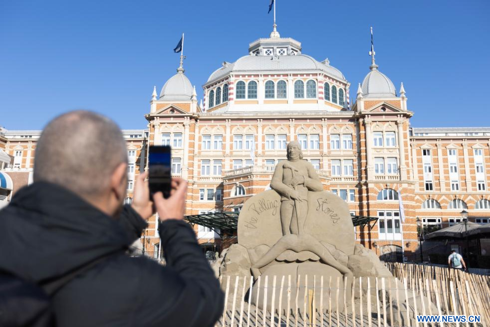 LA HAYE, 5 avril (Xinhua) -- Un homme prend une photo d'une sculpture de sable sur la plage de Scheveningen à La Haye, aux Pays-Bas, le 4 avril 2025. (Xinhua/Sylvia Lederer)