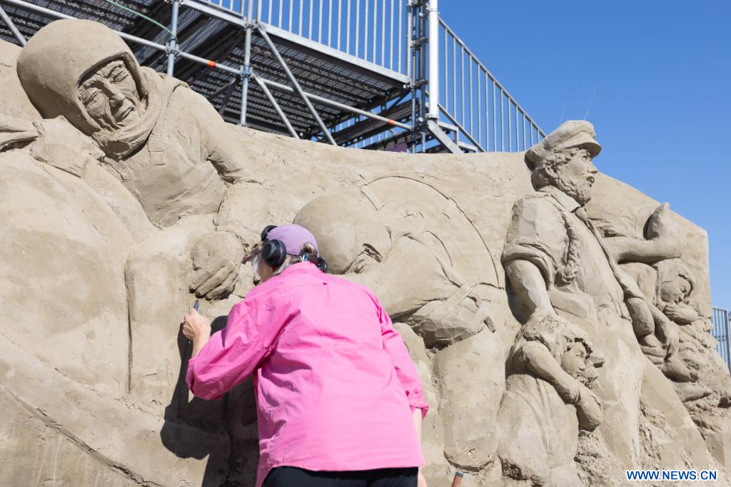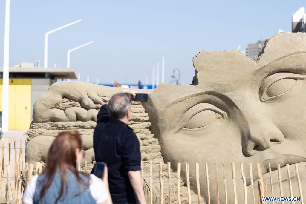 LA HAYE, 5 avril (Xinhua) -- Un artiste travaille sur une sculpture de sable sur la plage de Scheveningen à La Haye, aux Pays-Bas, le 4 avril 2025. (Xinhua/Sylvia Lederer)