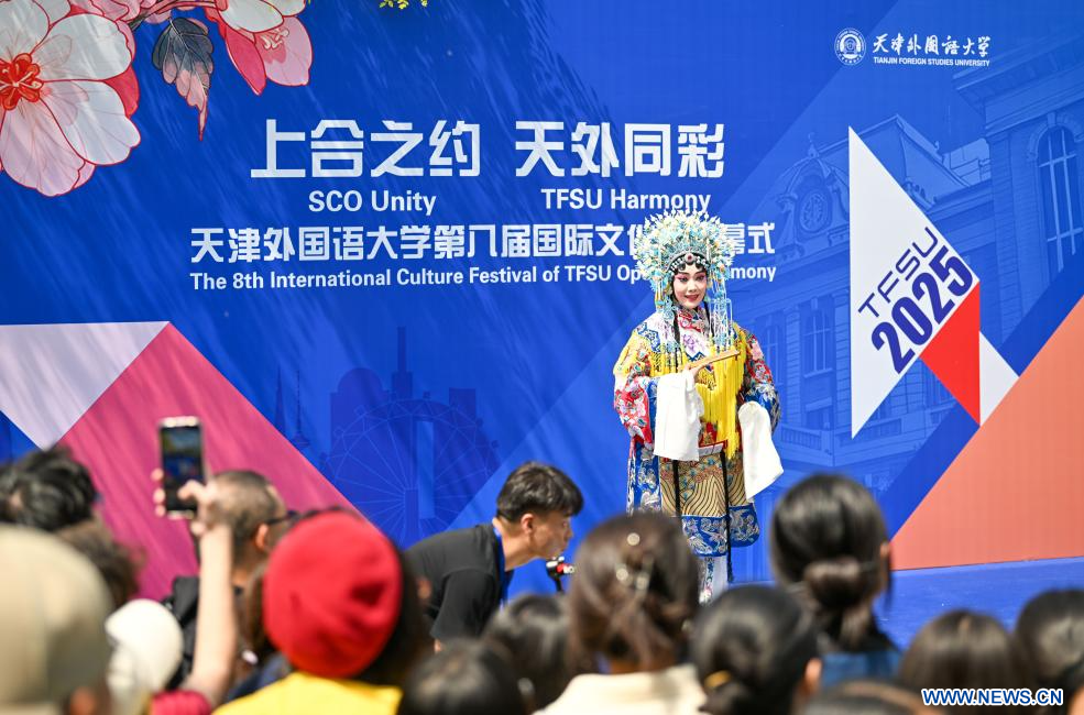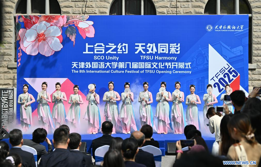 TIANJIN, 21 avril (Xinhua) -- Un spectacle a été présenté le 20 avril 2025 à l'occasion du 8e Festival culturel international de l'Université des études étrangères de Tianjin, à Tianjin, dans le nord de la Chine, le 20 avril 2025. Plus de 300 étudiants et professeurs, originaires de plus de 60 pays et régions ont participé au festival. (Photo : Sun Fanyue)