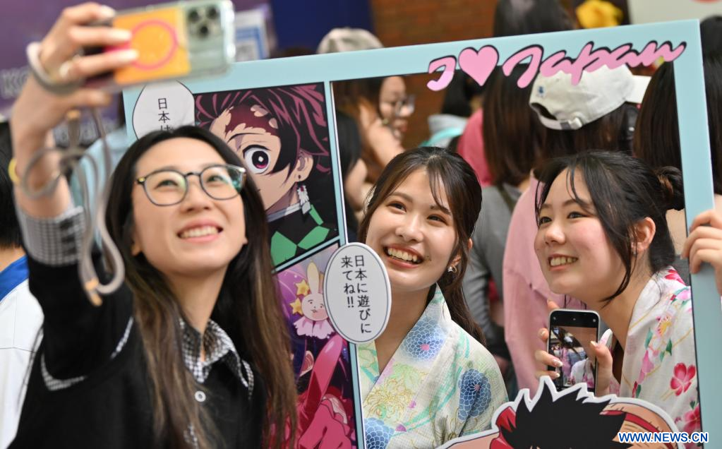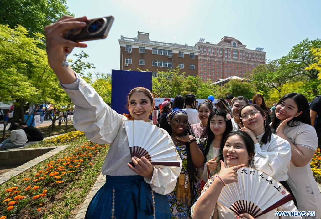 TIANJIN, 21 avril (Xinhua) -- Des étudiantes posent pour des photos lors du 8e Festival culturel international de l'Université des études étrangères de Tianjin, à Tianjin, dans le nord de la Chine, le 20 avril 2025. Plus de 300 étudiants et professeurs, originaires de plus de 60 pays et régions ont participé au festival. (Photo : Sun Fanyue)
