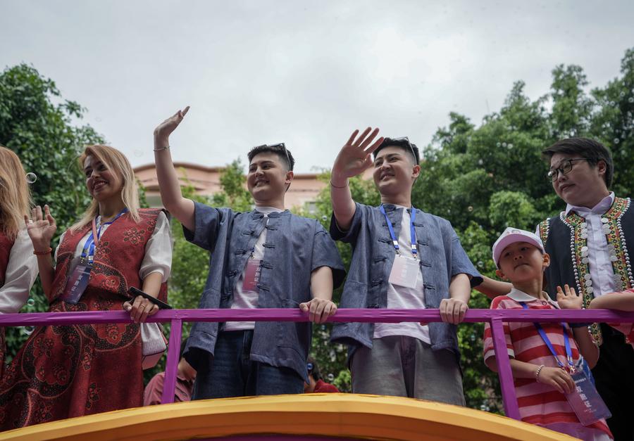 MOJIANG, 2 mai (Xinhua) -- Plus de 1.000 jumeaux et autres naissances multiples venus du monde entier ont participé jeudi à un défilé organisé à l'occasion du 19e Festival international des jumeaux à Mojiang, dans le district autonome hani de Mojiang, dans la province du Yunnan (sud-ouest de la Chine).