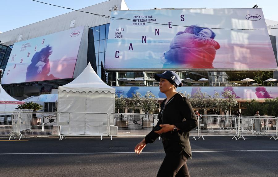 CANNES, 13 mai (Xinhua) -- Une femme passe devant de gigantesques affiches du Festival international du film de Cannes, à Cannes, dans le sud de la France, le 12 mai 2025. La 78e édition du Festival de Cannes se déroule du 13 au 24 mai. (Xinhua/Gao Jing)