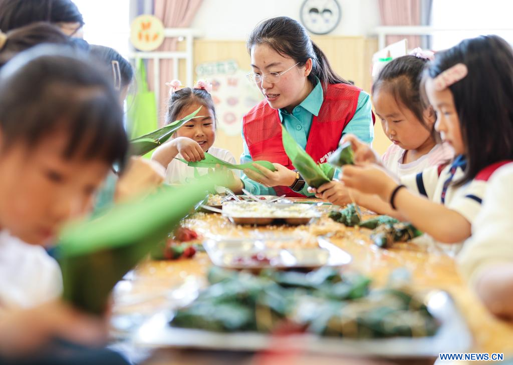 BEIJING, 29 mai (Xinhua) -- Une enseignante apprend aux enfants à préparer le zongzi, un gâteau de forme pyramidale composé de riz gluant et emballé dans des feuilles de bambou ou de roseau, dans une maternelle de la ville de Liaocheng, dans la province chinoise du Shandong (est), le 28 mai 2025. La Fête des bateaux-dragons, également connue sous le nom de Fête Duanwu, tombe le cinquième jour du cinquième mois du calendrier lunaire chinois. Cette année, elle sera célébrée le 31 mai. (Photo : Ma Hongkun)