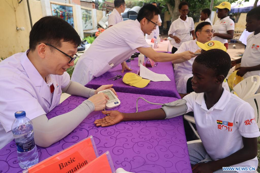 ACCRA, 8 juin (Xinhua) -- Les médecins de la 14e équipe médicale chinoise au Ghana fournissent des examens médicaux gratuits aux enfants de l'orphelinat Motherly Love à Accra, au Ghana, le 7 juin 2025. La 14e équipe médicale chinoise au Ghana a offert des fournitures essentielles et fourni des services médicaux gratuits samedi à cet orphelinat situé dans la capitale du pays d'Afrique de l'Ouest. (Xinhua/Seth)