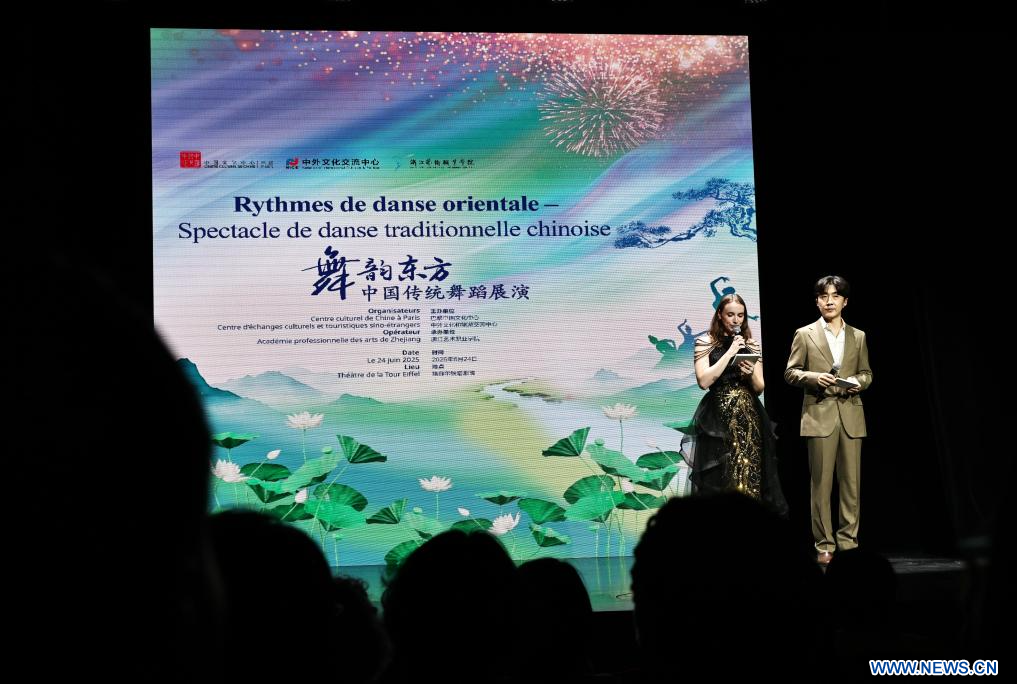 PARIS, 26 juin (Xinhua) -- Présentation d'un spectacle de danse traditionnelle chinoise au Théâtre de la Tour Eiffel, à Paris, en France, le 24 juin 2025. (Xinhua/Gao Jing)