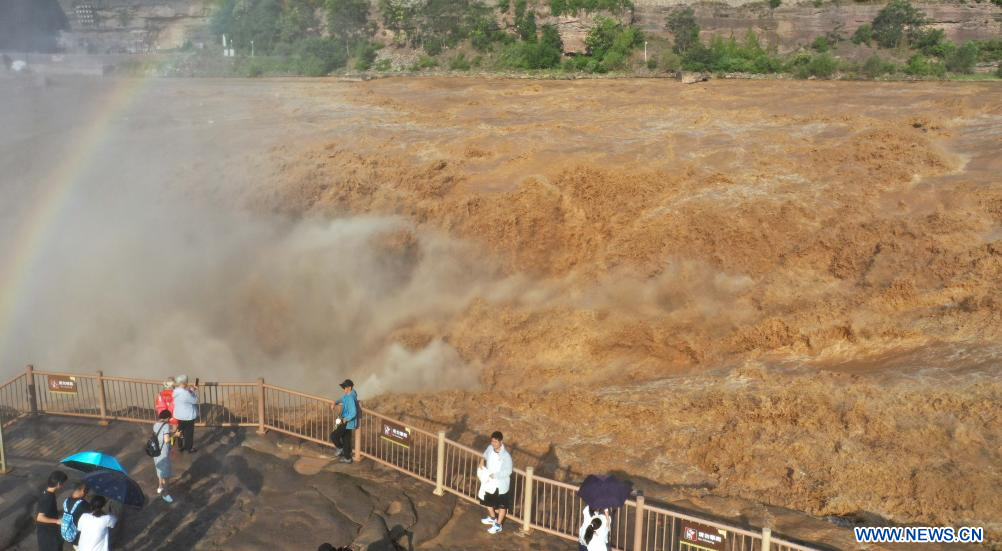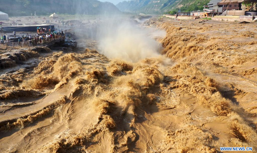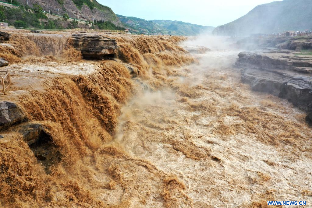 JIXIAN, Shanxi, 5 juillet (Xinhua) -- Vue aérienne de la cascade de Hukou sur le fleuve Jaune à Jixian, district de la province chinoise du Shanxi (nord), le 4 juillet 2025. (Photo : Lyu Guiming)