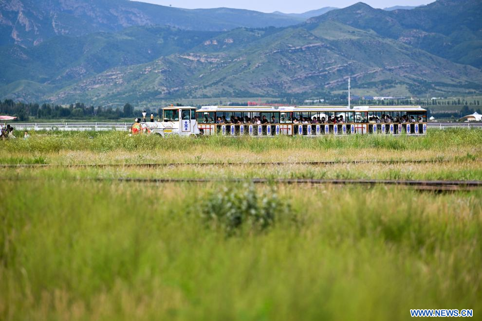 HOHHOT, 5 août (Xinhua) -- Des touristes parcourent une prairie à bord d'un train touristique à Hohhot, dans la région autonome de Mongolie intérieure (nord de la Chine), le 3 août 2025. (Photo : Li Zhipeng)