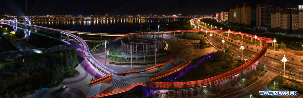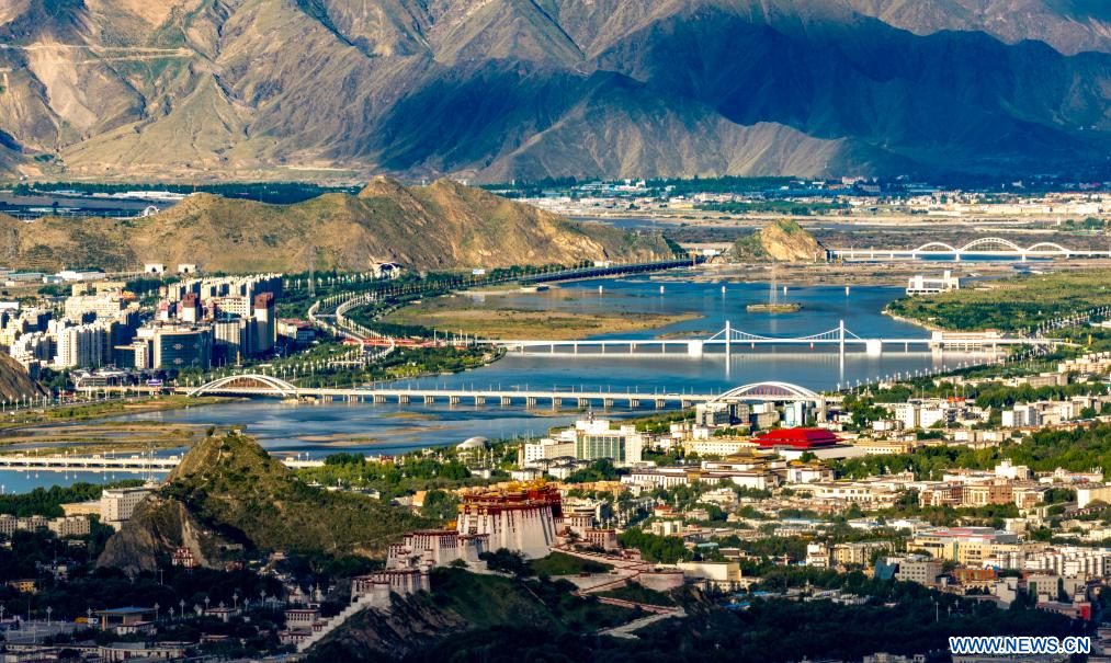 LHASSA, 6 août (Xinhua) -- Panorama aérien assemblé montrant un pont sur la rivière Lhassa, à Lhassa, dans la région autonome du Xizang (sud-ouest de la Chine), le 30 juillet 2025.