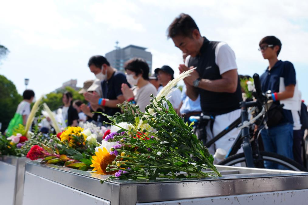 HIROSHIMA, 7 août (Xinhua) -- Des gens sonnent la cloche de la paix lors d'une cérémonie commémorative pour marquer le 80e anniversaire du bombardement atomique à Hiroshima, au Japon, le 6 août 2025. La ville japonaise d'Hiroshima a organisé mercredi cette cérémonie au parc du Mémorial de la paix, tandis que des citoyens se sont rassemblés au Dôme de la bombe atomique d'Hiroshima pour critiquer la politique gouvernementale de renforcement militaire. (Xinhua/Jia Haocheng)Des gens déposent des fleurs en mémoire des victimes du bombardement atomique à Hiroshima, au Japon, le 6 août 2025. (Xinhua/Jia Haocheng)Des manifestants se rassemblent au parc du Mémorial de la paix à Hiroshima, au Japon, le 5 août 2025. (Xinhua/Jia Haocheng)