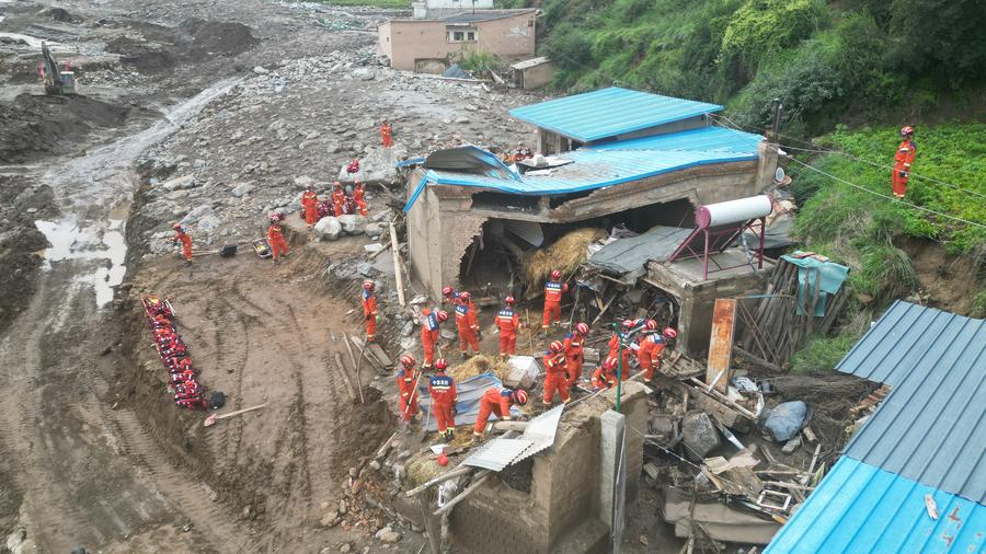 Photo prise par un drone montrant des sauveteurs recherchant les personnes disparues dans le village de Jiuzhuanggou à Yuzhong, district de la province chinoise du Gansu (nord-ouest), le 10 août 2025.(Photo : Dang Ruilin)Des sauveteurs recherchent les personnes disparues dans le village de Xinglongshan à Yuzhong, district de la province chinoise du Gansu (nord-ouest), le 10 août 2025.(Photo : Bai Qiyuan)Des sauveteurs recherchent les personnes disparues dans le bourg de Mapo, à Yuzhong, district de la province chinoise du Gansu (nord-ouest), le 10 août 2025.(Photo : Bai Qiyuan)■
