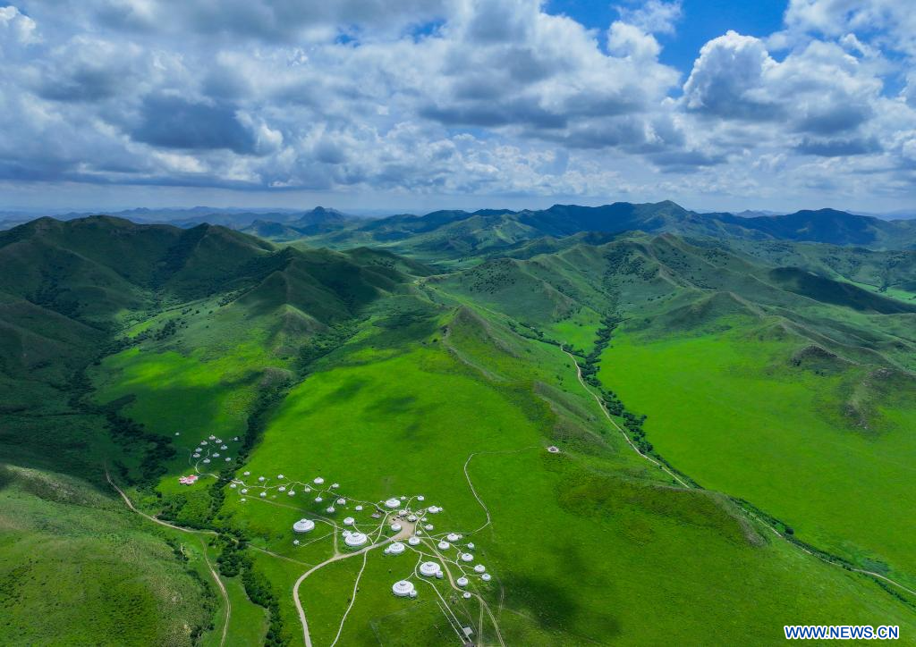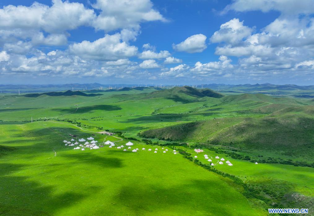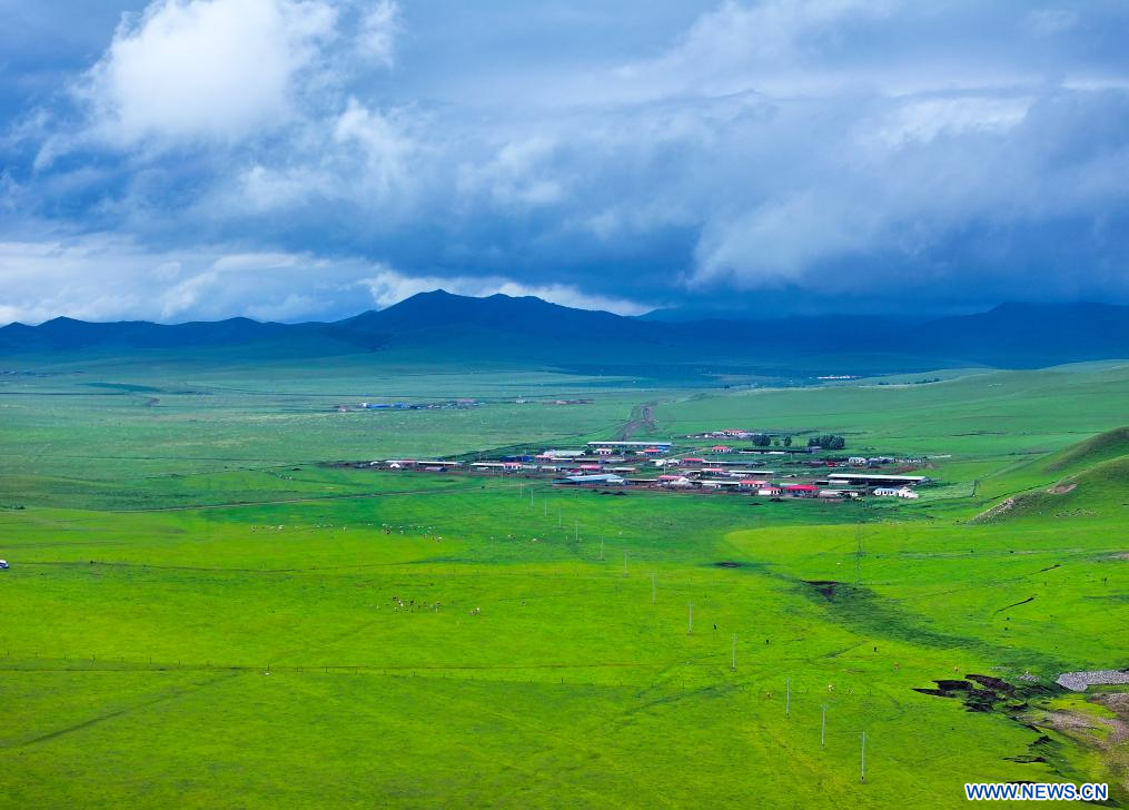 TONGLIAO, 12 août (Xinhua) -- Photo aérienne prise par un drone montrant la prairie de la bannière de Jarud, à Tongliao, dans la région autonome de Mongolie intérieure, dans le nord de la Chine, 11 août 2025.