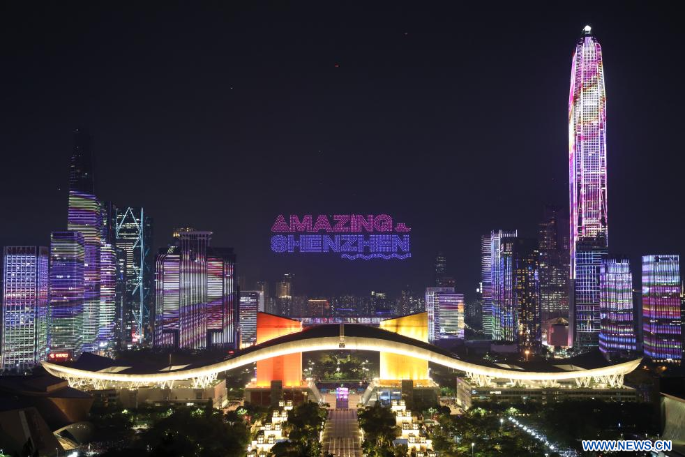 SHENZHEN, 27 août (Xinhua) -- Spectacle de drones lumineux à l'occasion du 45e anniversaire de la zone économique spéciale de Shenzhen, dans la province du Guangdong, dans le sud de la Chine, le 26 août 2025. (Photo : Mao Siqian)