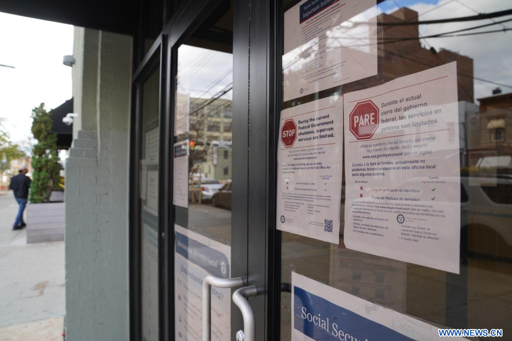 NEW YORK, 1er novembre (Xinhua) -- Cette photo prise le 31 octobre 2025 montre un bureau de l'Administration de la sécurité sociale à New York, aux Etats-Unis, le 31 octobre 2025. En raison de la fermeture du gouvernement fédéral américain, certains services publics ont été interrompus, les parcs nationaux et le système aérien ont été affectés, et l'incertitude économique s'est accrue. (Xinhua/Zhang Fengguo)