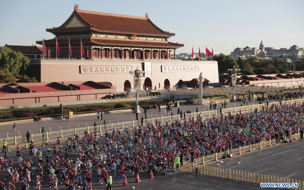 BEIJING, 2 novembre (Xinhua) -- Des participants courent devant la place Tian'anmen lors du marathon de Beijing 2025, à Beijing, capitale chinoise, le 2 novembre 2025. (Photo : Guo Yu)