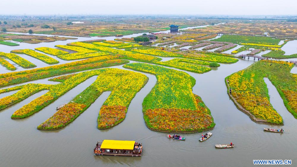 BEIJING, 11 novembre (Xinhua) -- Photo aérienne prise par drone montrant des touristes en bateau dans un site pittoresque de la ville de Xinghua, dans la province chinoise du Jiangsu (est), le 10 novembre 2025. (Photo : Zhou Shegen)